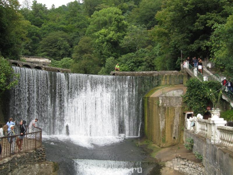 Водопад в Новом Афоне.Рядом с храмом Симона Кананита находится знаменитый искусственный Новоафонский водопад. В пойме р.Псырцха вода, застаиваясь, образовывала болота. Для осушения этих болот и создания на их месте прудов иноки в 1882 г. соорудили плотину со шлюзами и водопадом (его высота - 8,6 м; длина по гребню - 21 м). Под водопадом были устроены обширные помещения, которые использовались как подвалы и холодильники. На плотине монахи построили двухэтажную каменную мельницу, рядом - пекарню. Вода по специальным каналам поступала также в лесопильню, прачечную, на кирпичный завод, орошала сады.