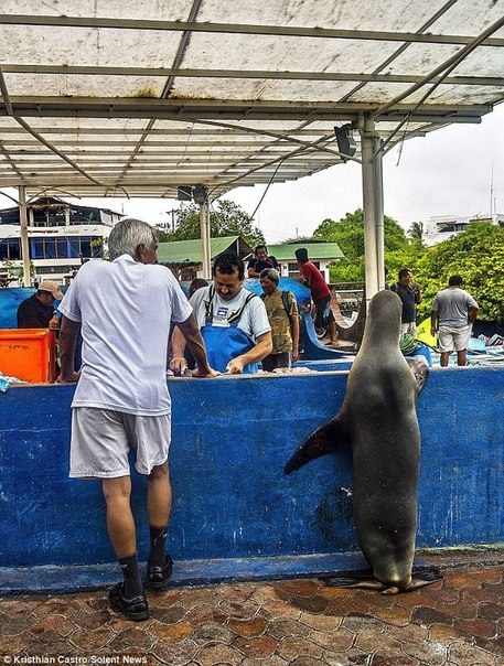 Дело в том, что, находясь на одном из самых знаменитых в мире Галапагосских островов (где, кстати, проводил свои исследования Чарльз Дарвин из-за большого количества местных видов фауны), люди уже привыкли к тому, что дикие животные могут свободно разгуливать среди них в повседневной жизни. Нахальный, но воспитанный зверек проделал путь от моря к рыбному ларьку и ждал своей очереди в течение целого часа. Получив от торговца рыбные отходы, удовлетворенный морской лев последовал обратно в море.