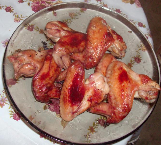 У нас были крылышки в меду и со специями жаренные и макароны