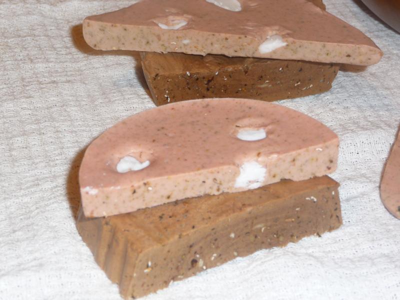 (я добавила немного трав, а они меняют цвет мыла со временем).
