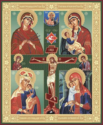 Это тип четырехчастной богородичной иконы. Иконы могут быть самые разные, в данном случае - Семистрельная, Утоли моя печали, третью не помню, а четвертая - Взыскание погибших.