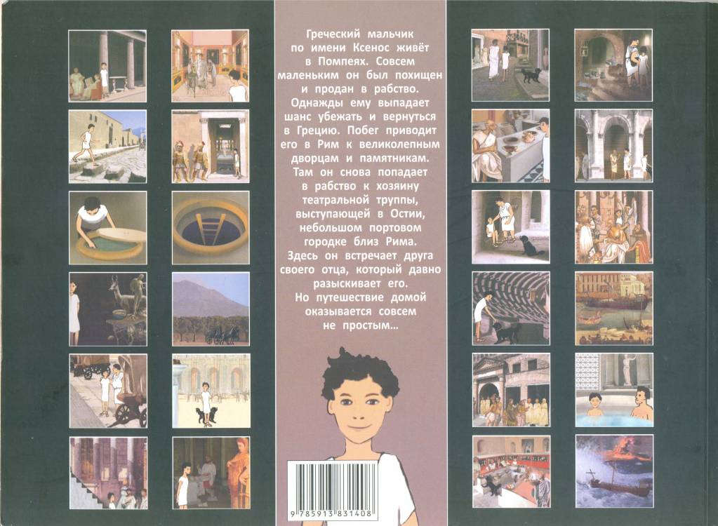 Книга адресована детям младшего и среднего школьного возраста. Читатель погружается в жизнь древних Помпей и Остии, путешествует вместе с маленьким Ксеносом, стремящимся вернуться домой. "Изюминка" издания - в его художественном оформлении. Автор книги, скульптор по образованию, проиллюстрировала её своими работами, сделанными во время многочисленных поездок по Италии. История в известных картинах, скульптурах, архитектурных памятниках предстаёт перед читателем живой, близкой. На полях и последних страницах размещены также фотографии современных Помпей. В конце книги есть краткие заметки о жизни в древнем Риме и Остии, а также толковый словарик и информация о городах и музеях, где находятся произведения искусства, вдохновившие автора.