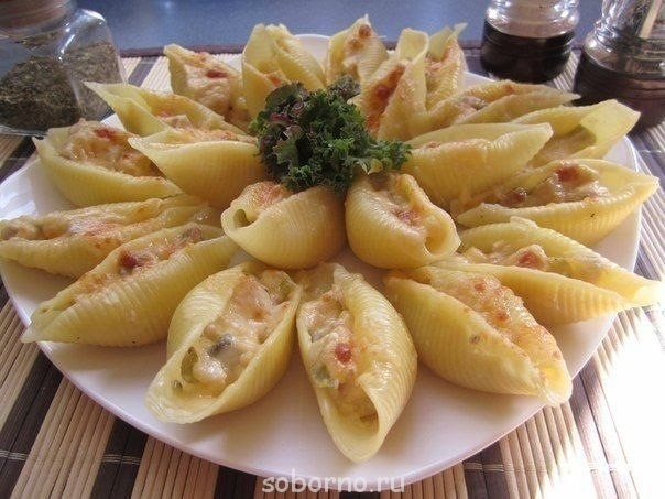 Приготовление: Ракушки отварить, откинуть на дуршлаг и дать чуть остыть, чтобы в руки можно было взять. Ложечкой берём начинку и фаршируем каждую ракушку, "укрывая" тёртым сыром. Для зарумянивания начиненные ракушки ставим в духовку.