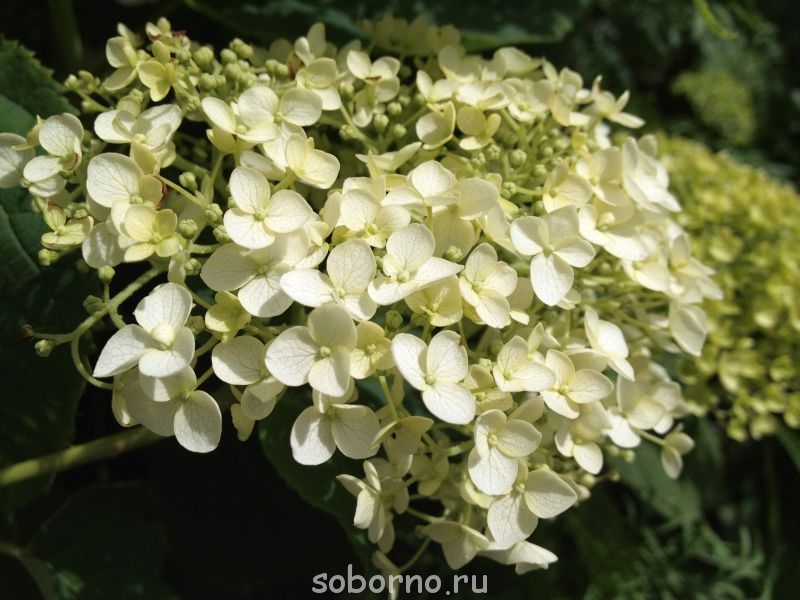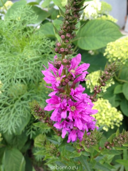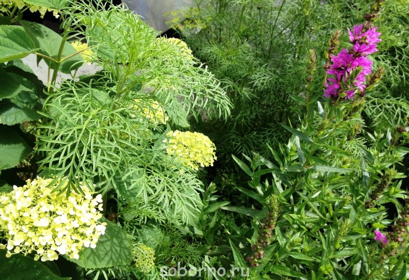 дербенник очень удачно дополняет белые шапки гортензии..