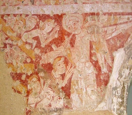 Наиболее хорошо сохранились редкие фрески на восточной стене храма – они изображают Страшный суд. Над алтарной аркой можно увидеть Пресвятую Троицу, справа от которой изображены души спасенных, а слева – осужденных грешников. Рядом сохранились изображенные фигуры 12 апостолов (или святых) со свитками, а также сцена воскресения мертвых.