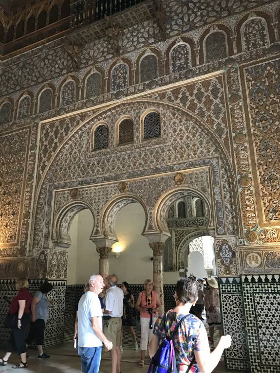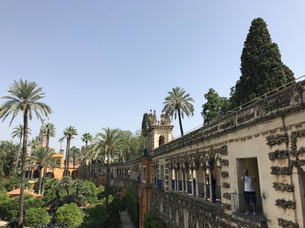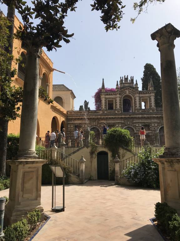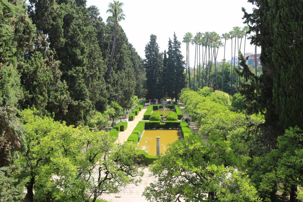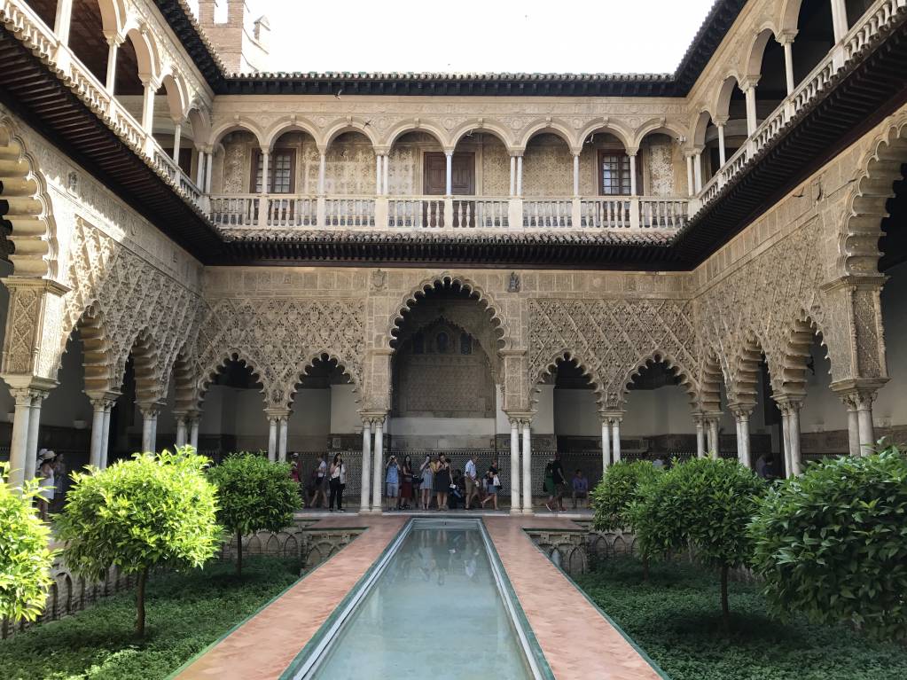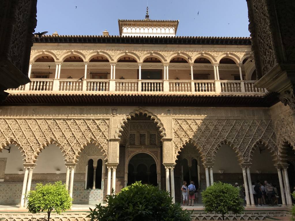 Севильский Алькасар, Real Alcazar de Sevilla, был построен на развалинах арабской крепости, первые строения датируются 1364 годом. Размерами он уступает гранадскому, но впечатляет своей красотой. Многие годы был резиденцией королей Кастилии, а затем — одной из резиденций королей Испании, которые одно время были богатейшими среди всех королевских династий Европы, поэтому дворец украшали, увеличивали и содержали в очень хорошем состоянии.