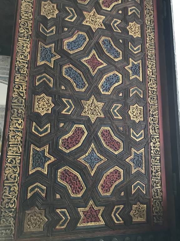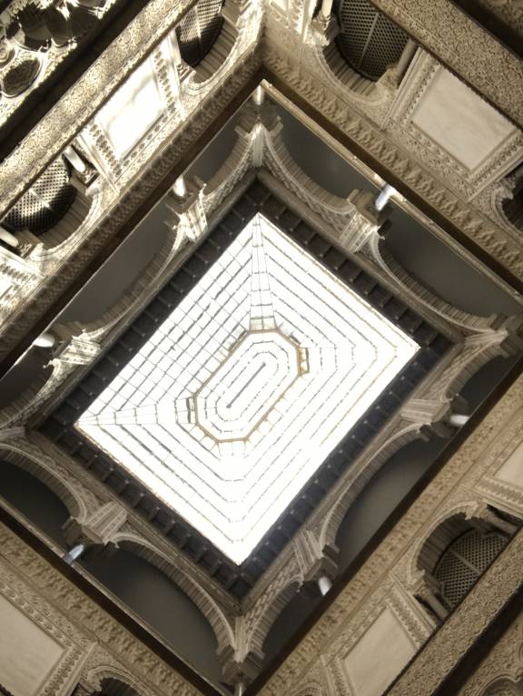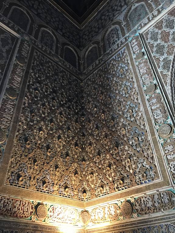 Официальные приёмы проводились в Зале Послов (Salón de Embajadores), который строили почти 12 лет. Его форма — квадрат со стороной 10 м. Уникальна центральная стена зала, которая оформлена фризом, состоящим из пятидесяти шести ниш. В каждой нише красуется портрет испанских королей, начиная от самого первого правителя вестготов, заканчивая Филлипом III. Арки в форме подков и позолоченный потолок украшены безупречной гипсовой резьбой. Потолок на телефон у меня вышел таким А на самом деле он такой