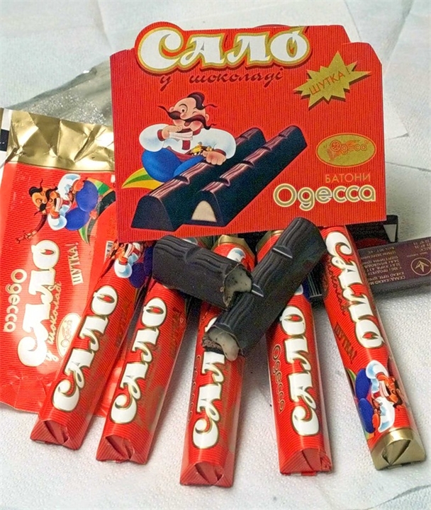 В Одессе компания АО «Одесса» подхватив интересную идею, выпустила шоколадный батончика с надписью «Сало в шоколаде» На продукте изображен усатый казак в синих шароварах с саблей и револьвером. Продукт совершенно не съедобен. Однако представители АО «Одесса» заявляют, что вкус - дело десятое. По их прогнозам, «Сало в шоколаде» вскоре займет первое место среди сувениров, подаренных украинцами российским друзьям.