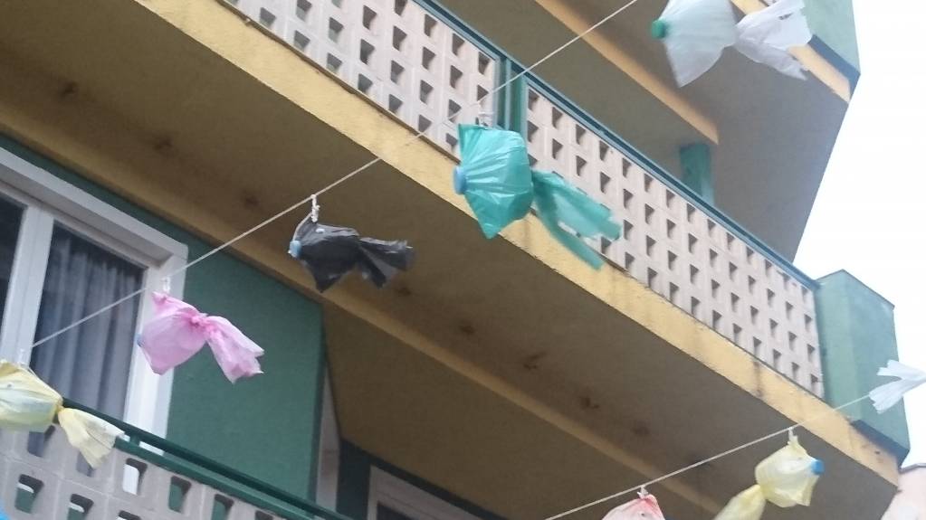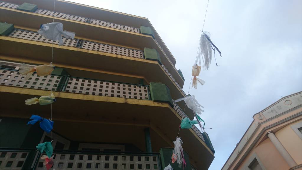 А вот хочу обратить ваше внимание на одно интересное творческое решение. Вдоль одной улочки были протянуты гирлянды. Когда мы присмотрелись, то поняли, что это рыбки и медузы. Сделаны они так: половинки пластиковых бутылок обернуты цветными пакетами, крышки - это носики у рыб. Медузы сделаны из белых пакетов, разрезанных на полосы. Просто, дешево и оригинально.