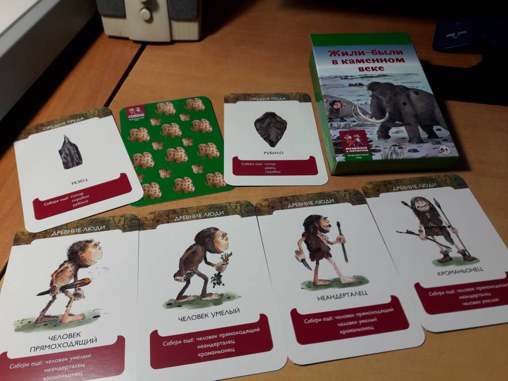 36 карточек нужно сгруппировать по темам: "орудия труда", работа, древние люди", "искусство", "племя", "Еда", "жилище", "Животные", "в пещере". Побеждает тот, кто в конце игры соберёт самое большое число серий. Рекомендую.