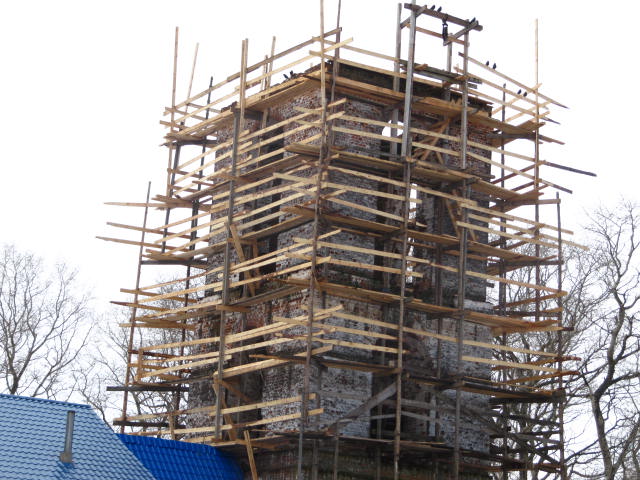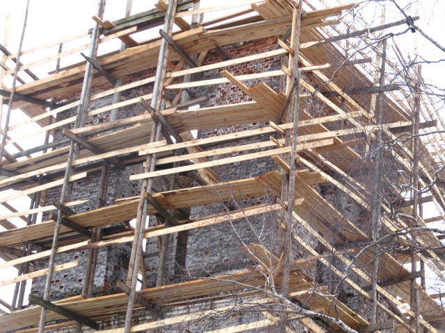 На улице устанавливаю леса вокруг колокольни