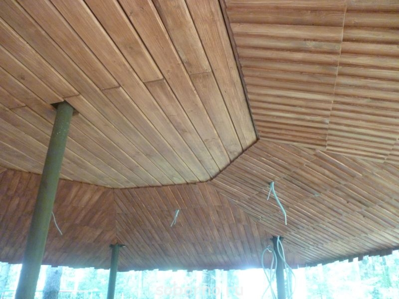 На потолок ушел месяц работы. Так как фирменный гонт(короткие тонкие досочки) очень дорогой (закащик экономит) , то делал сам.