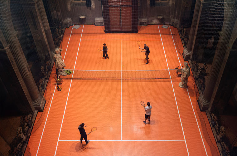 Художник разместил теннисный корт в старинной миланской церкви
