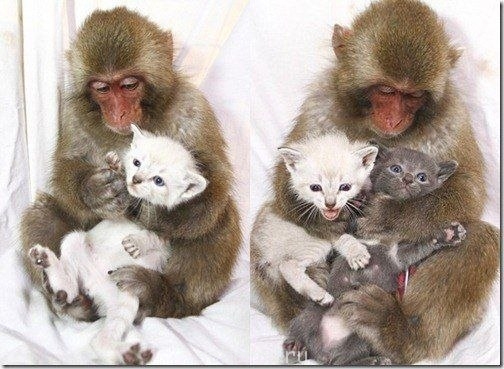 Японская макака Джида из американского зоомагазина взяла на воспитание двух очаровательных котят.