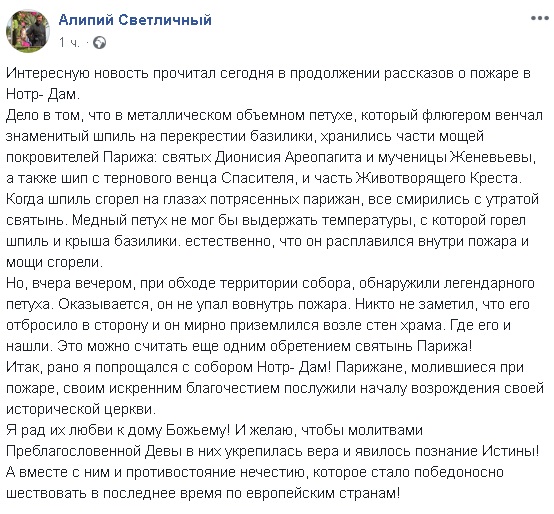 Под завалами после пожара в соборе Парижской Богоматери (Нотр-Дам-де-Пари) найдена фигура медного петуха, венчавшая шпиль храма. В ней находятся один из шипов с тернового венца Иисуса Христа и частицы святых покровителей Парижа.