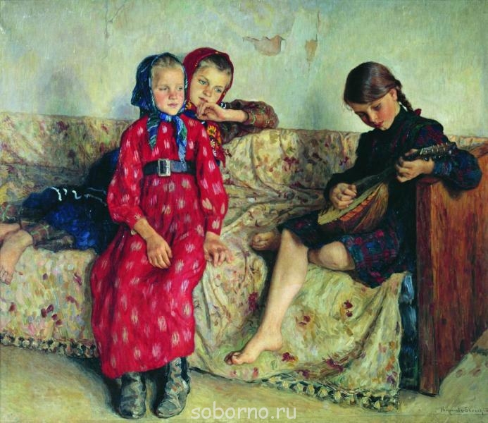 Людям молодым, знающим то время только по книгам, может показаться нарочитость в изображаемых Николаем Петровичем длинных деревенских рубахах, в больших, как бы выставленных напоказ, заплатах. Но ничего нарочитого в этом не было, скорее фотографическая точность. Удомельские крестьяне в то время носили домотканные из овечьей шерсти и льна одежды и лапти из бересты. Так называемой городской одежды тогда в деревнях почти нельзя было встретить. Деревенские ребятишки, которых часто писал Николай Петрович, не знали маек и другой, обычной дня нашего времени детской одежды. Холщовые, крашенные добытой на месте краской, длинные штаны, рубаха тоже из холста (точи) с длинными рукавами и навыпуск, без пояса, старенькая выгоревшая фуражка - вот и все, что полагалось на лето. Зимой тоже холщовые штаны, онучи, лапти, какой-нибудь ветхий, состоящий больше из заплат, овчиный пиджачок, меховая шапка из шкуры убитого зимой зайца. Все это было ветхое, много раз чиненное, рваное, разноцветное. За короткий исторический срок мы неизмеримо далеко ушли от времен бедности и нищеты. Поэтому многие картины Богданова-Бельского приобретают теперь особое значение.