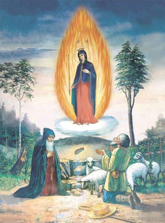 Почаевская икона Божией Матери находится в Почаевской обители. На горе, где сейчас расположен монастырь, поселились два инока в 1340 году. Один инок после молитвы пошел к вершине горы и, вдруг, увидел Божию Матерь, стоявшую на камне и окруженную пламенем. Он позвал брата посмотреть на чудо. Третьим свидетелем видения был пастух Иоанн Босой. Он взбежал на гору, и они втроем прославили Бога. На камне, где стояла Пресвятая Богородица, навсегда остался отпечаток Ее правой стопы.
