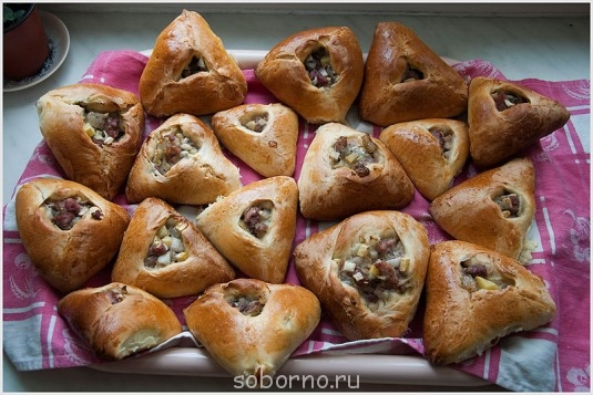 Замесить пресное тесто и нарезать небольшими кусками (как для обычных пирожков). Придать им форму шарика, затем раскатать в лепешки размером с чайное блюдце. На лепешки выложить приготовленную начинку в форме треугольника, приподнять с трех сторон свободные края теста и защипить, оставив в середине отверстие.