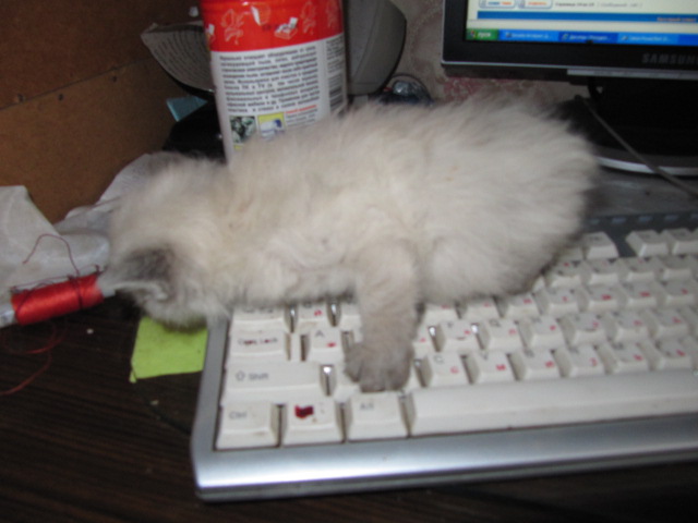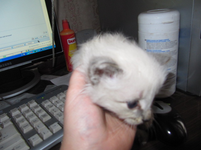 2. Это Арёнка (потому что Трешка уже старая; когда окотилась, забыла, что надо котенка кормить. Или молока уже нет. Короче, мы ее кормили из пипетки, а она все детство орала – то голодная, то живот, то пить, то кошка-мама мимо маячит… Поэтому Арёнка). Выросла голубоглазой красавицей. Всеобщая любимица была. К сожалению, весной не стало ее – несчастный случай. Был ей год.