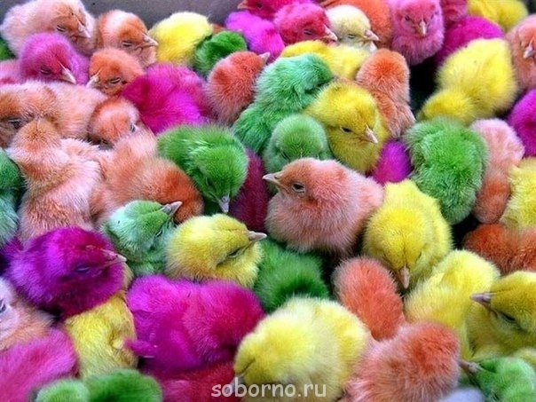 На ферме "Трипл Д" в местечке Палмер решили впрыснуть в яйца специальный краситель, в результате чего на свет появились разноцветные птенцы. Инъекцию сделали на 18-й день инкубационного периода, а дырочку от укола запечатали капелькой воска.