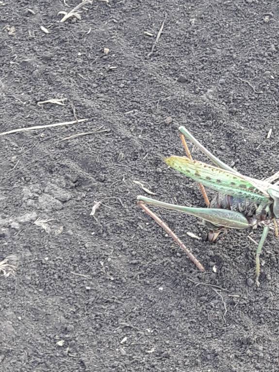 Ранней осенью мы с Кириллом шли с поля по дороге и случайно увидели самку кузнечика. Мы её застали в неподходящий момент: она откладывала яйца. А мы раза четыре перечитали Яна Ларри "Необычные приключения Карика и Вали" В повести как раз был подобный эпизод. Самка откладывала в землю яйца с помощью яйцеклада и так спасла Ивана Гермогеновича от медведки. Мы, как папарацци, снимали беззащитное насекомое.