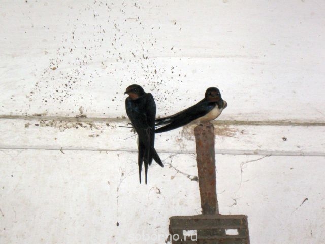 Второй выводок не успел подрасти,чтобы улететь.Первый птенец погиб на Преображение.На Успение приехали,на полу лежит мертвая большая ласточка и один птенец.Во время службы ещё один птенец упал из гнезда мертвым .Солнышко:У нас в храме ласточки гнездо свили.