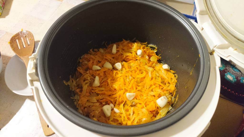 Нарезать лук полукольцами, спассеровать в мультиварке. Морковь очистить, натереть нв терке, добавить к луку, спассеровать вместе до мягкости моркови. Выключить режим "Выпечка". Добавить перец, паприку, зиру, перемешать. Разровнять, разложить крупно нарезанный чеснок.