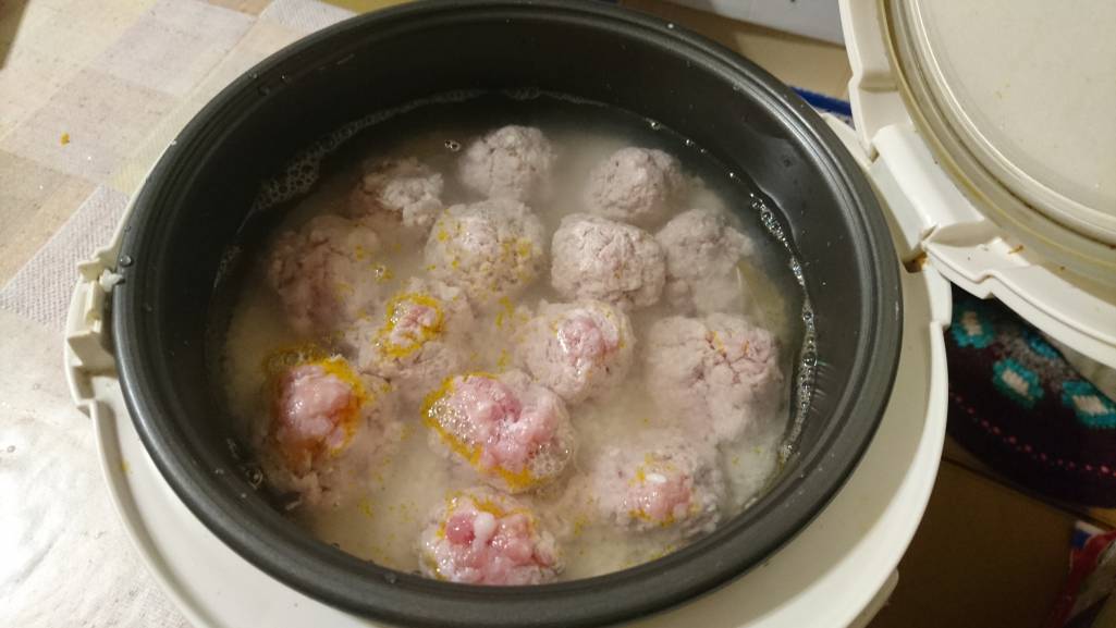 Воду из риса слить, промыть еще раз. Добавить щепотку соли, перемешать. Выложить ровно рис на зажарку. Сверху выложить шарики из фарша. По широкому ножу аккуратно налить кипяток, чтобы покрывало фрикадельки. Поставить на режим "Плов". Дождаться,окончания программы. Посыпать зеленью. Вуаля.