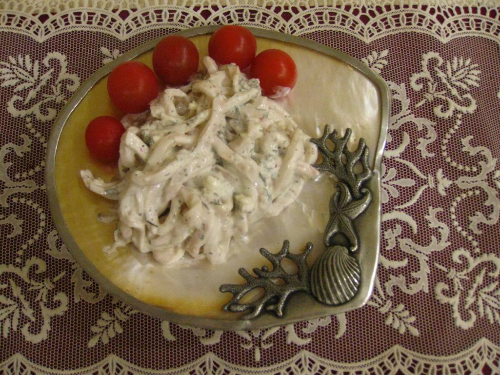 Кальмары отварить, порезать, добавить творог, сметану, чеснок, острый перец, зелень, перемешать. Приятного аппетита!