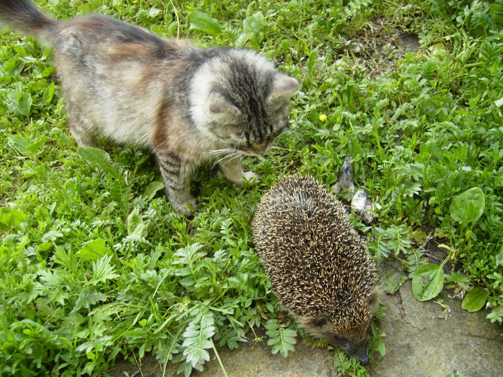 у меня во дворе семья ежей живет, после родов мамка ежиха и днем вылезает поесть, поскольку молока не хватает. Пищи ей хватает у меня, но на запах рыбы случается и в дом кто-нибудь из них заползет) Молока не ставлю, знаю что им это повредит, а рыбки иногда положу. Ночью встречаемся во дворе. Не вижу, как фоты вставить.