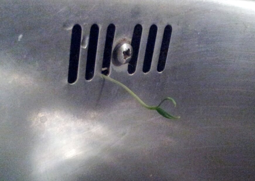 Сегодня утром обнаружила росток: пробился через решетку бокового стока раковины. Никогда в жизни такого не видела. Тем более вот тут - двадцатый этаж, кактусы и роза на балконе, фикус Николай в спальне, откуда вообще, какими судьбами? Мы же не в джунглях. Влажности - никакой. И потом, Москва сама по себе акт попрания природы. Город продуцирующий смерть. И вдруг - железо и вода родили сына.