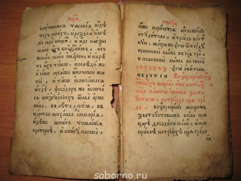 Здравствуйте! Не знаю у кого спросить... Дело в том, что давным давно в нашем доме появилась книга без обложки и написанная на древнеславянском языке ( как я думаю, возможно ошибаюсь). Насколько я разобрала эта книга связана с церковью. Но я плохо разбираюсь в церковной литературе. Короче говоря, книгу эту спасли из огня еще в начале 20-го века и состояние ее оставляет желать лучшего. Я продолжаю ее хранить, но очень хочется выяснить о ней побольше. Пожалуйста, если кто-нибудь может мне в этом помочь, жду с нетерпением!