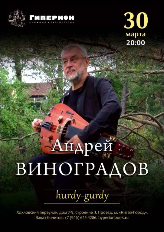 30 марта (четверг) в 20:00 в Москве, в книжном клубе-магазине "Гиперион" состоится концерт музыканта и композитора Андрея Виноградова (европейская колёсная лира).