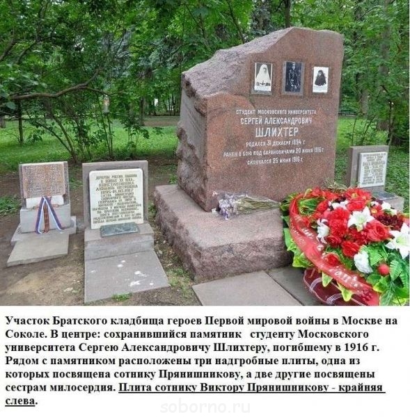 Сотник Виктор Прянишников был первым погребен на Братском кладбище. Место захоронения Прянишникова сохранилось и находится возле памятника Шлихтеру С.А. – студента Московского университета, погибшего в 1916 г. под Барановичами.