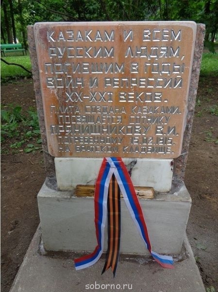 На плите высечена надпись: «Казакам и всем русским людям, погибшим в годы войн и репрессий ХХ-ХХI веков. Посвящается сотнику Прянишникову В.И. погребенному 15.02.1915 на Братском кладбище».