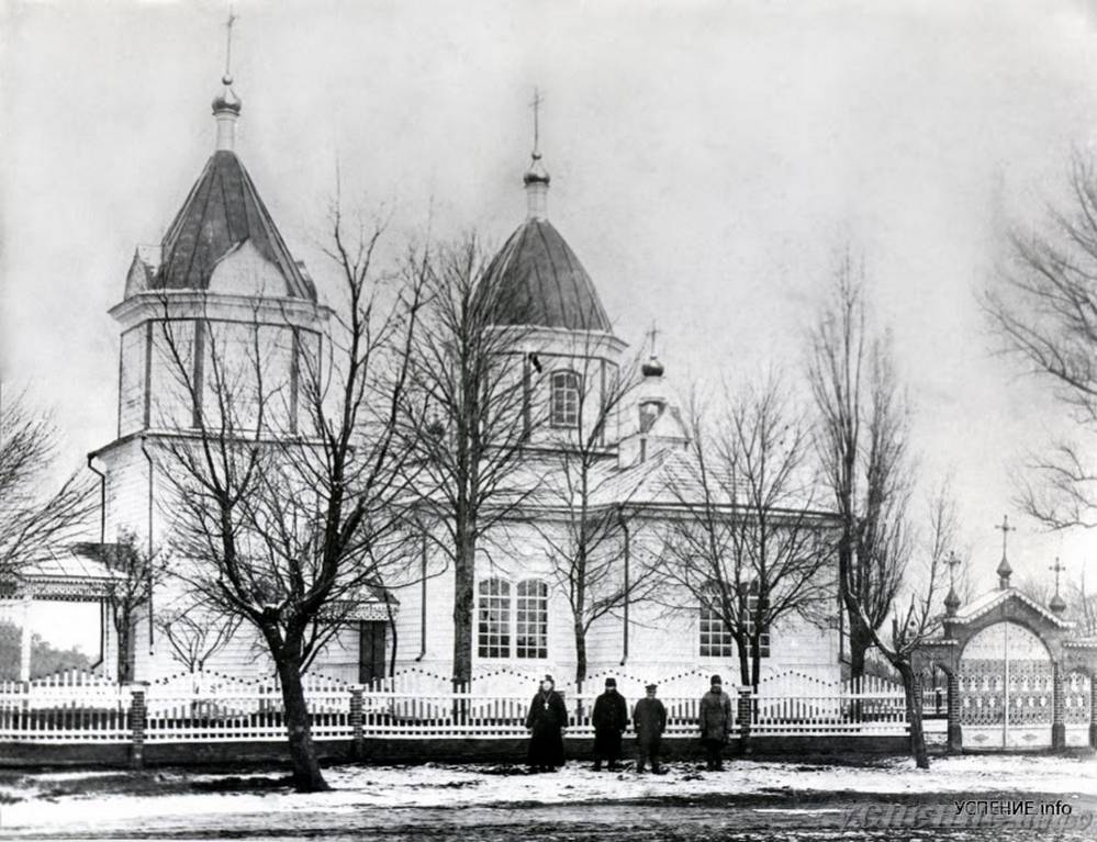 Деревянная церковь была срублена в 1879 вместо прежней, сгоревшей. Рубленный "в лапу", обшитый тёсом и декорированный в "русском стиле" крестообразный в плане храм состоит из четверика, светового восьмерика под восьмигранным куполом с луковичной главой на тонкой шейке, массивной прямоугольной апсиды с пониженными прирубами, далеко выступающих боковых объёмов, вытянутой в ширину трапезной с двумя малыми колонными крыльцами и утраченной колокольни, от которой сохранился притвор с центральным колонным крыльцом.
