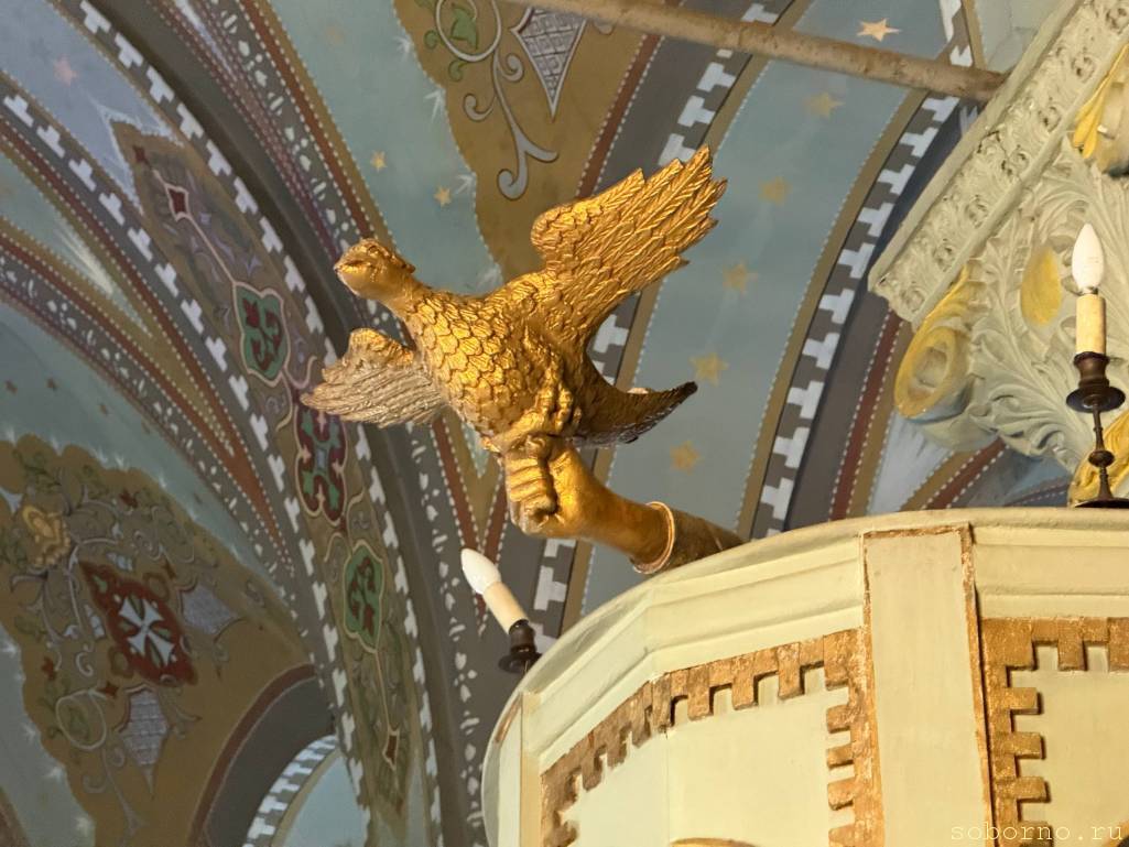 В церкви монастыря на амвоне увидели необычный символ - скульптуру в виде руки держащей за лапы взлетающую птицу (фото приложено)